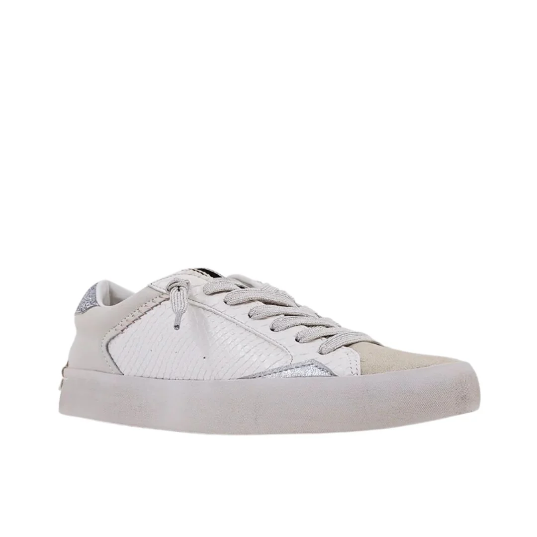 Introducing Shu Shop's latest addition - the RUBY, a stylish and contemporary low-top sneaker. The upper is made of textiles and buttery faux leather, including artificial suede. The bone-colored body features a snake-lookalike texture mixed with nude and grey, complemented by modern and minimalist stitching details. The design is visually clean and includes distressed patches and a glittery ankle for a cool twist. The rubber soles are designed for long-lasting comfort and support, perfect for all-day wear. Pair them with trousers or an ankle skirt for a modern look that will turn heads. These sneakers boast timeless appeal and superior craftsmanship that will not disappoint.